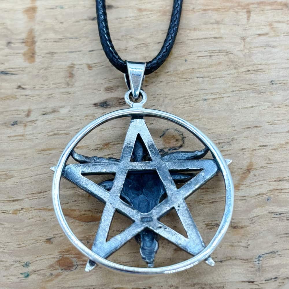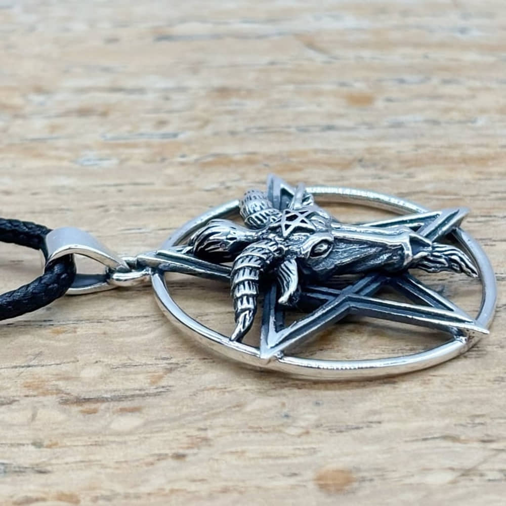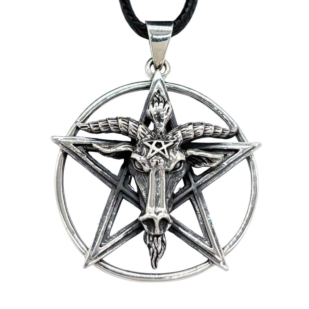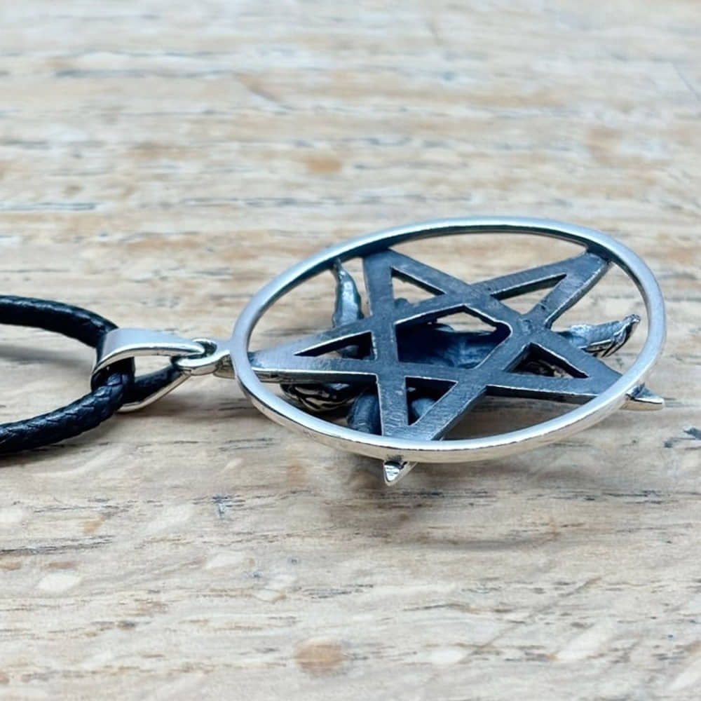 925 Sterling Silver Baphomet Pentagram Pendant And Cord Necklace 33mm