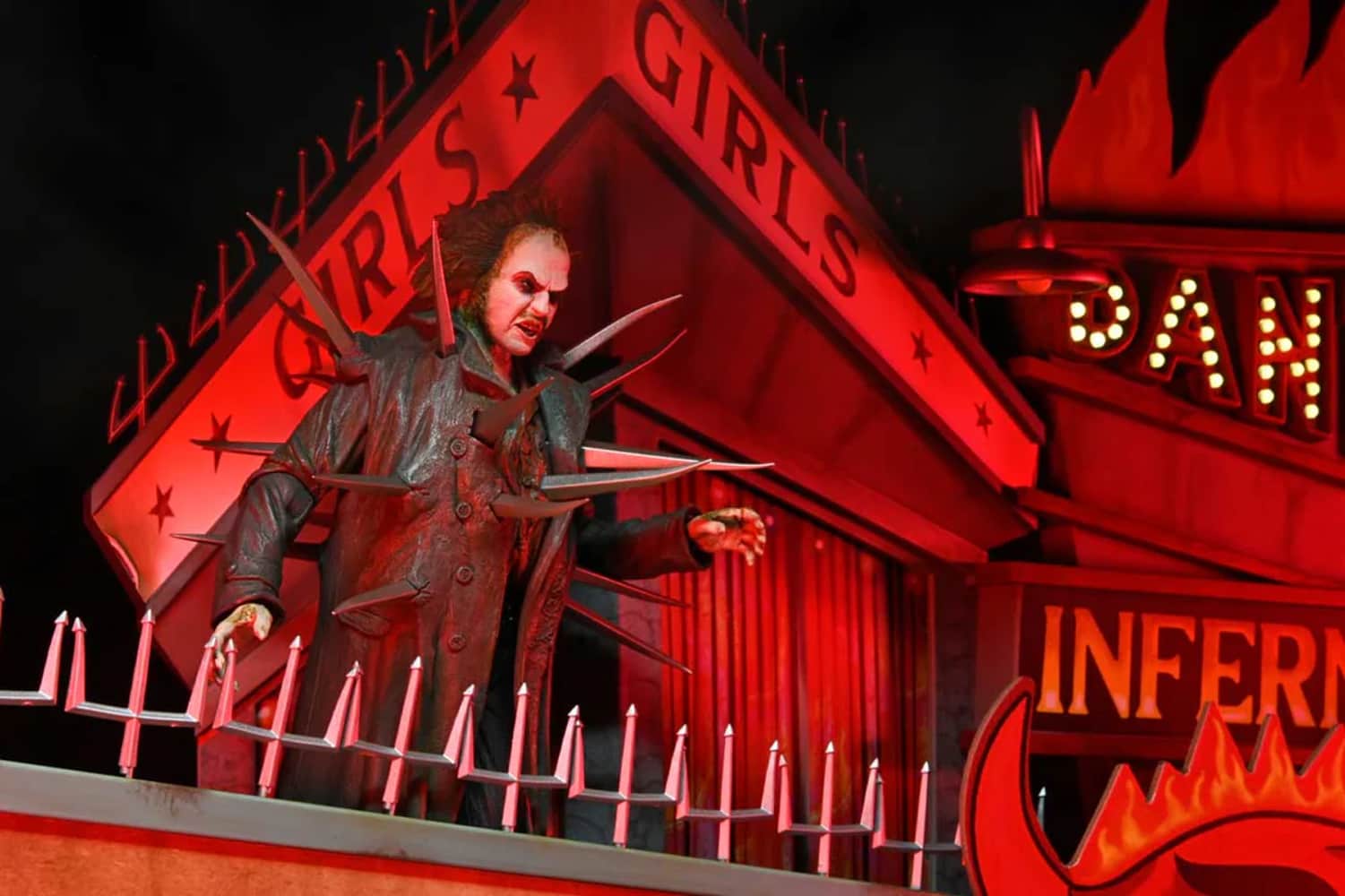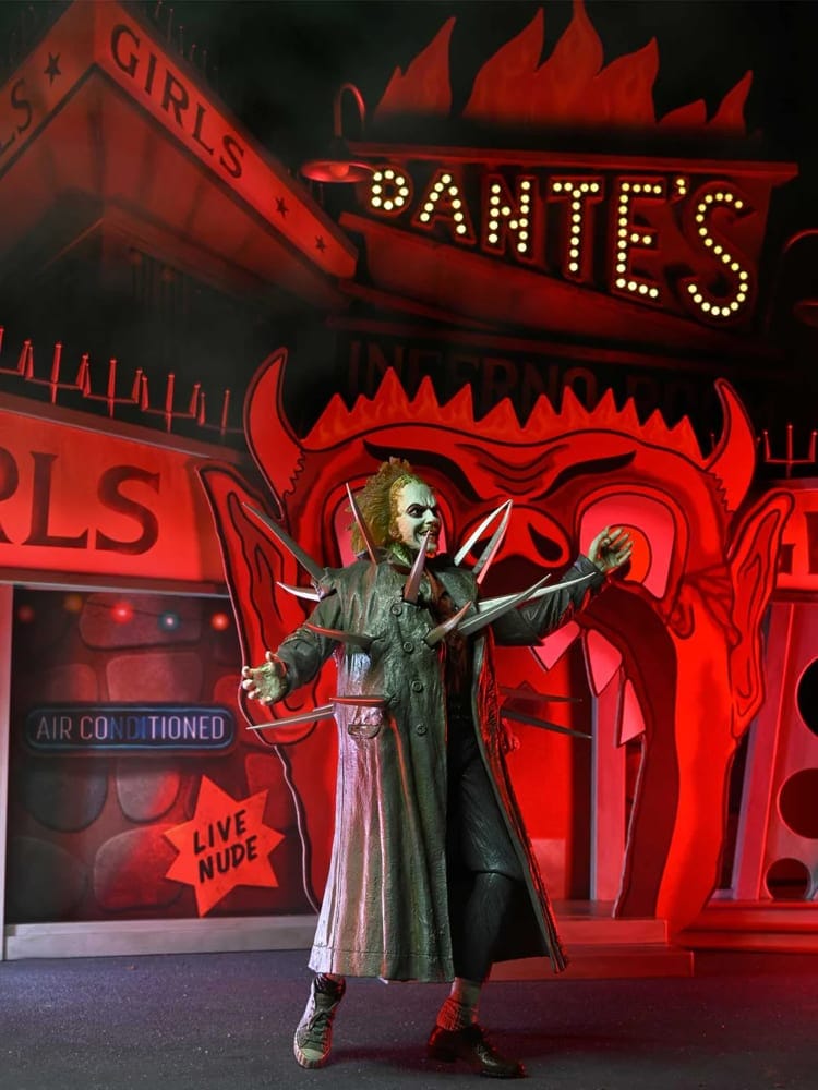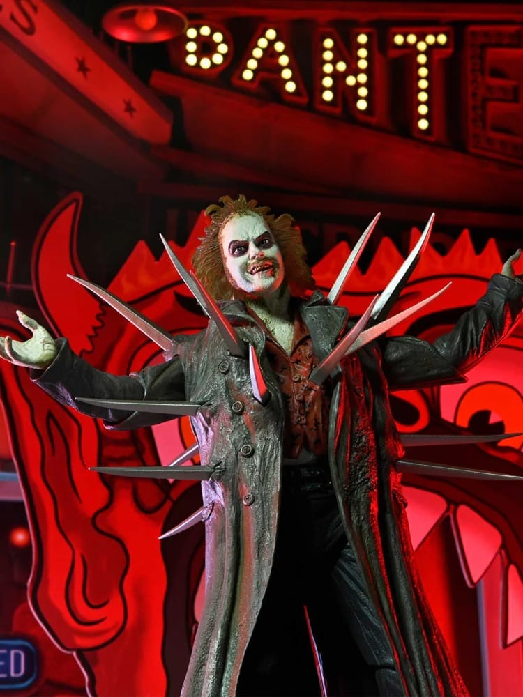 - An exclusive Ultimate Beetlejuice articulated action figure sporting his spiked trench coat look from the scene