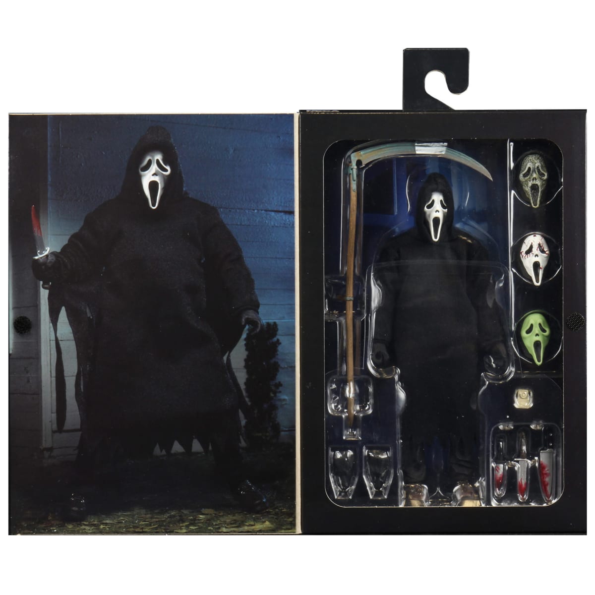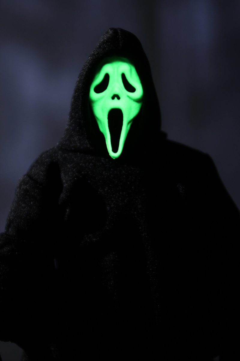 Ghost Face stands approximately 7″ tall. Is dressed in an all-fabric robe for full poseability, and comes with a disturbing amount of sharp objects including: